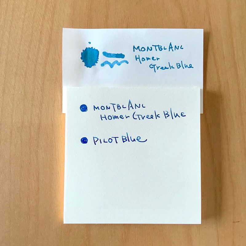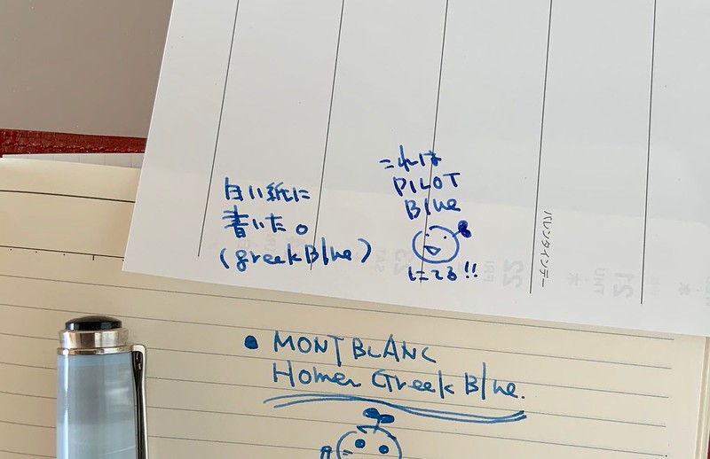 お店の筆記台に備え付けてあった紙では、まるで色彩雫の紺碧インクのように、深くて「真っ青」という感じでした。