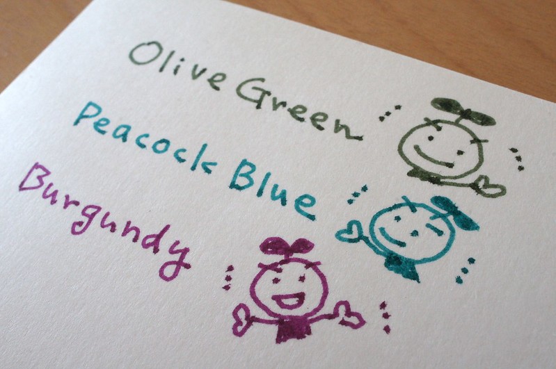 ピーコックブルーは、比較的予想通りな”明るいあおみどり”だったのですけれど、渋めのオリーブグリーンとの対比が面白くて、試し書きしているうちに気に入ってしまいました。