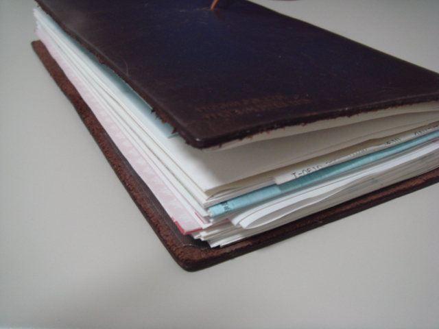 切符や伝票類、旅中で手に入れたあらゆるものを貼り付けたせいで、良い具合に膨れあがり、ちゃんと使い切った感じ。