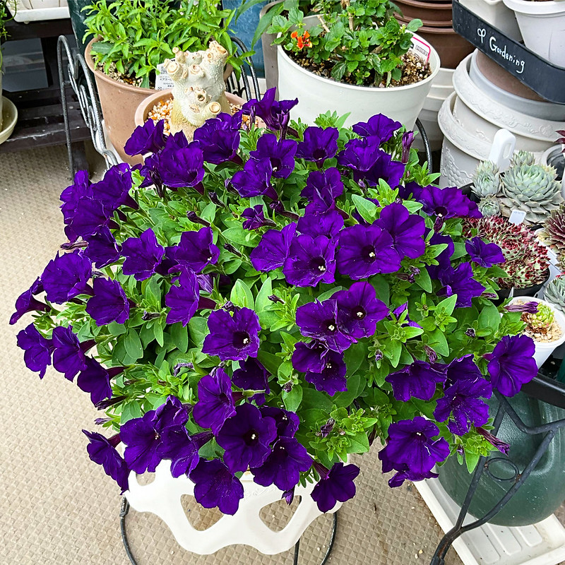 特に、今シーズン初めて育てているPWのフルーリアムール モーブシフォンの花がカーネーション並みに大きくて、重力でちょっと下がるところがナデシコというよりはペチュニアみたい。