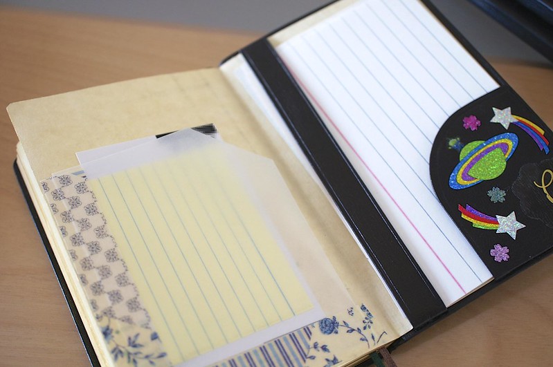 後ろのポケットは、メモ用紙として5*3サイズのカードをいつも数枚入れていますが、逆側にも手作りで増設したり(小型紙片用の、グラシン紙+マスキングテープ製半透明ポケット。)、シールでキラキラさせたりして、革手帳の威厳からかけ離れ遊び放題です。