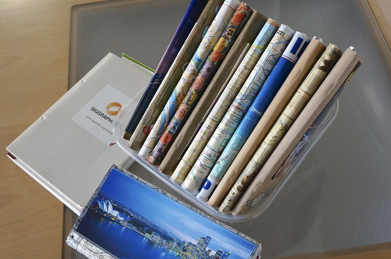 (上写真のように、何ミリか上にはみ出すものもちょっとはあるんですけれど)現地で集めたほとんどの紙類のサイズが、削らずぴったりとおさまることに毎度感心してます。