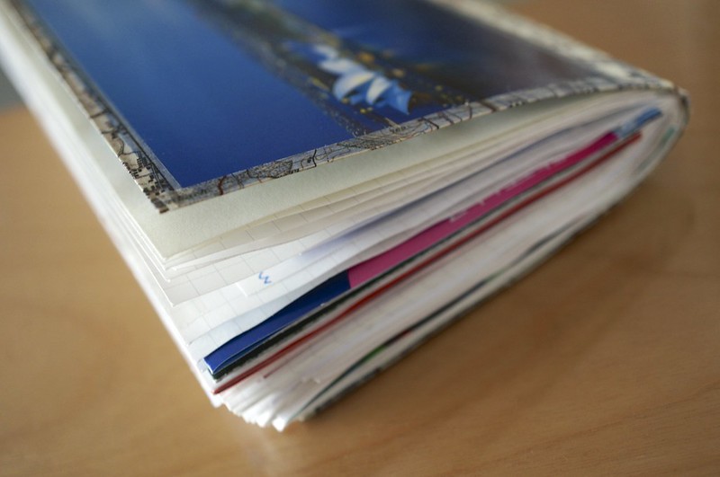 レシート類だけでなく、地図や書類も貼っていくとこんなに厚くなってしまうのですけれど、何日か、重しを乗せて放置しておくとだんだんまっすぐになってくるのですよ。