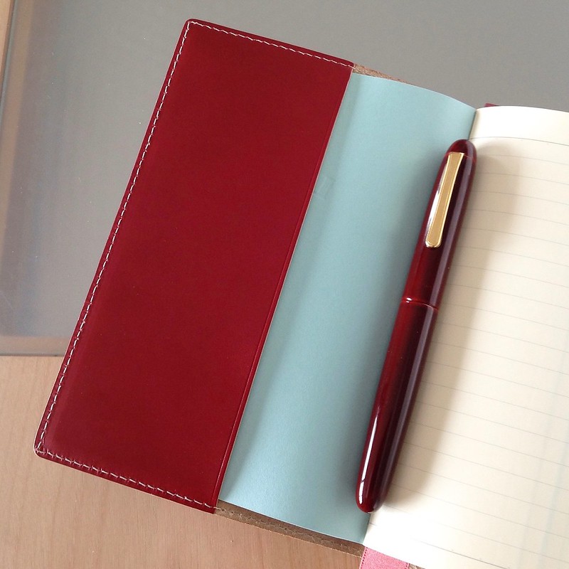 (本体赤革+内側ナチュラル色革にし、左右の内ポケット程度はカスタマイズで追加したい。ペンホルダーも伸縮式タイプなら邪魔にならないかも。)