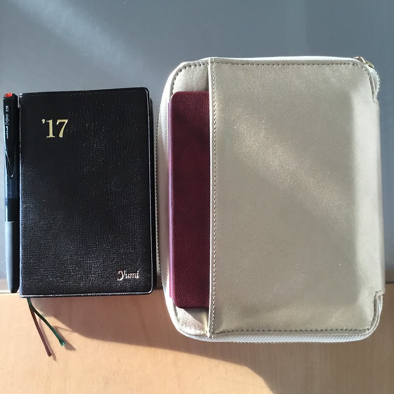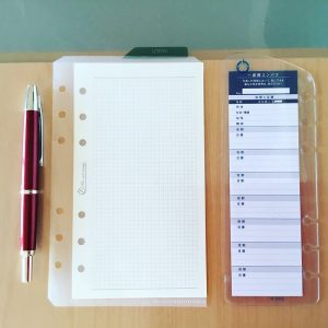 右側の差し込みには能率手帳ゴールド、ペンホルダーにはだいたいいつもsignoのボールペンを入れてます。
