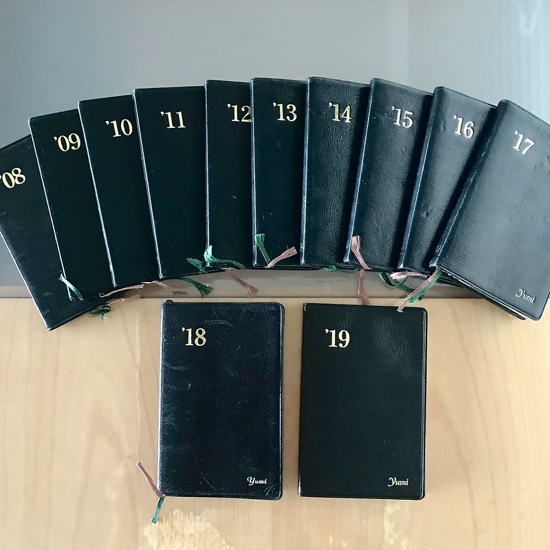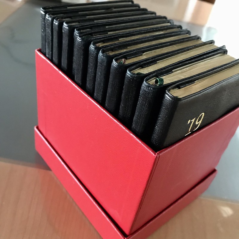 普段は、過去2年分くらいを手元にの引き出しに常備し、それより前のは箱のなかに立てて本棚に置いてます。