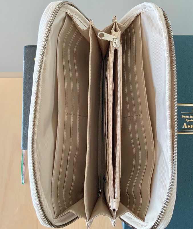真ん中のファスナーつきの部屋にペン類をがしゃっと詰め(廉価万年筆など含む)、周囲のポケットに小さい手帳を差込み(巾的にはWEEKSまで入ります。能率手帳やA6の手帳はもちろん、スリムタイプならバイブルサイズのバインダーもOK)反対側にiPhone etc.