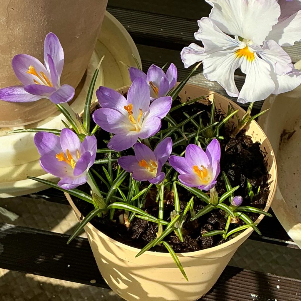 枯れた芝生みたいな芽が出ていて、割引価格138円だったクロッカスの鉢。