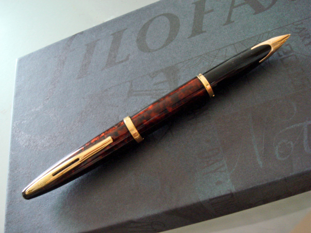 あくまでも私見として、ウォーターマンにはクールモダンよりクラシックな華やかさが似合うよなあ、と以前から勝手に思っていた私には、金色パーツづかいのカレン(「デラックス」は含まず)が黒軸だけでしたので、買うとしたらこれになるんだろうと思ってました。