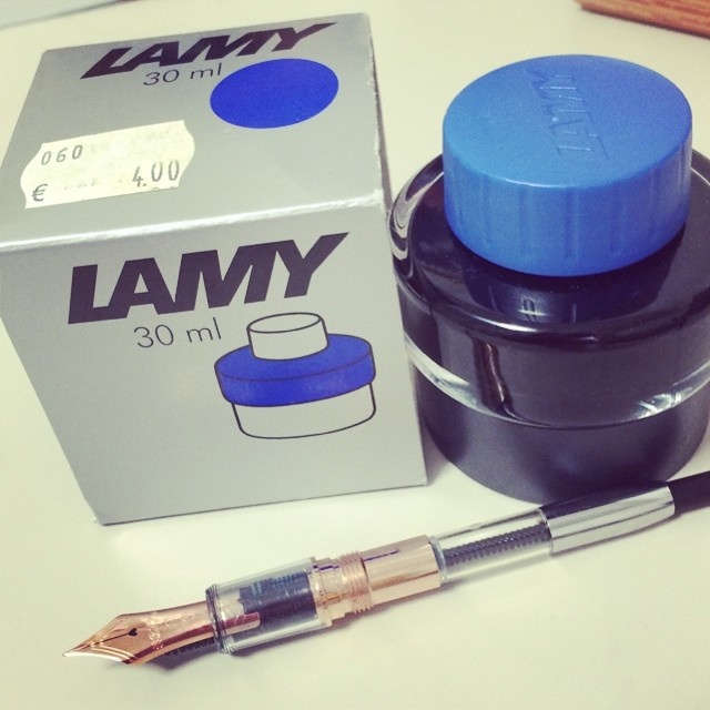 買ったばかりの時は、ウォーターマンのミッドナイトブルーであおみどりを楽しみ、今日までは久々にラミー青インクのラピスラズリのように輝く青みにうっとりしていましたが。